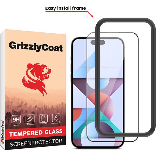 GrizzlyCoat Easy Fit iPhone 15 Pro Verre trempé Protection d'écran - Compatible Coque + Cadre d'installation - Noir