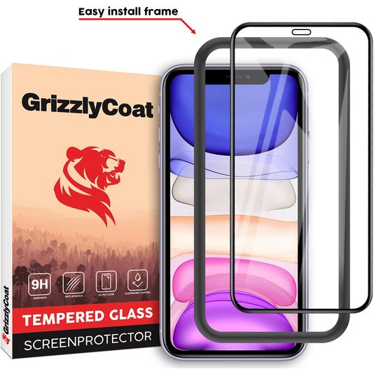 GrizzlyCoat Easy Fit iPhone 11 Verre trempé Protection d'écran - Compatible Coque + Cadre d'installation - Noir