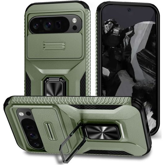 Mobigear Armor Ring Cam Slide Coque Google Pixel 9 Pro XL Coque arrière Rigide Anti-Chocs avec Anneau-Support et Protecteur Lentilles - Vert