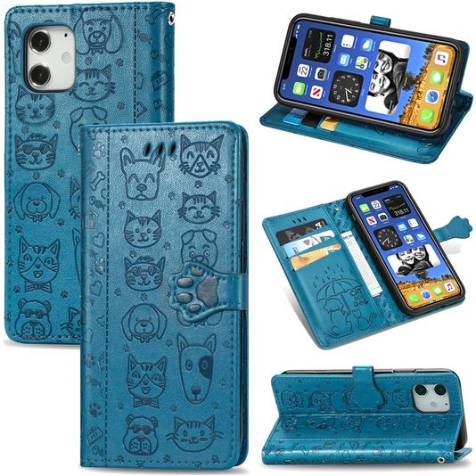 Mobigear Cat and Dog Housse iPhone 12 Etui Porte-Monnaie - Bleu