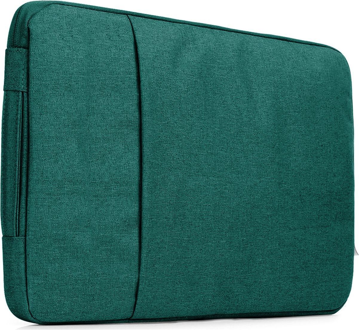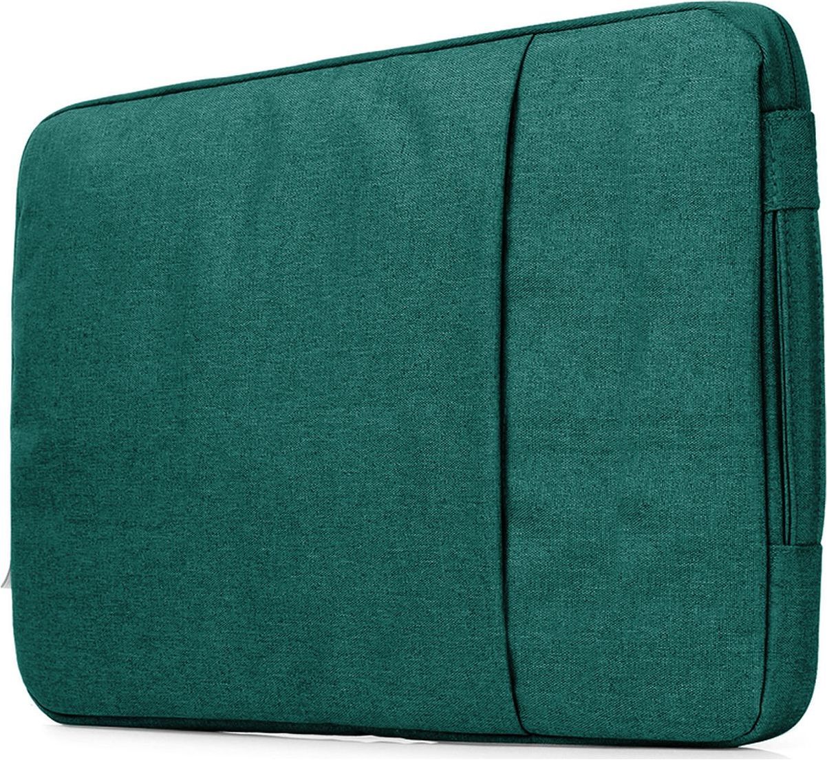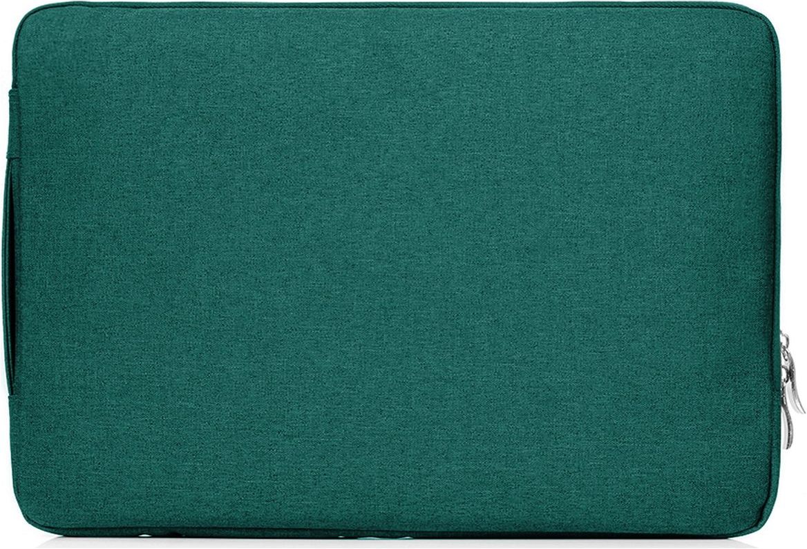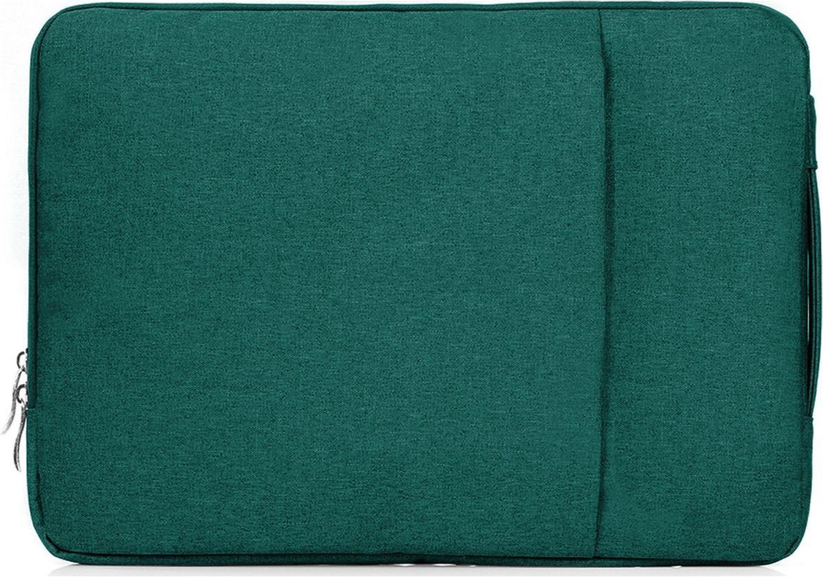 L'ordinateur portable pochette est fabriqué en polyester et est de couleur vert. Avec le fermeture éclair, vous fermez le sac en toute sécurité.