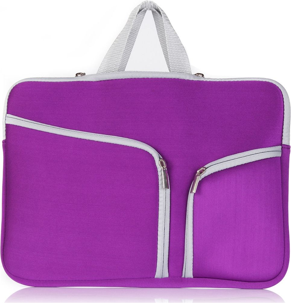 L'ordinateur portable pochette est fabriqué en néoprène absorbant les chocs et est de couleur violet. Avec le fermeture éclair, vous fermez le sac en toute sécurité.