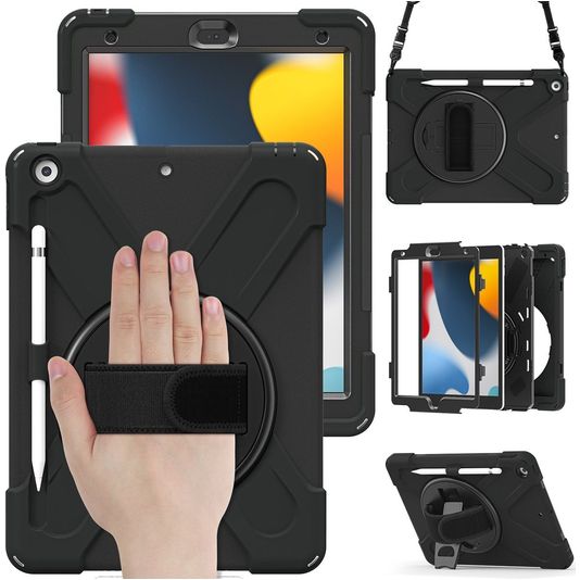 Mobigear SureGrip XGuard Coque iPad 7 (2019) Coque arrière en Plastique rigide,Silicone + Porte-crayon + Bandoulière + Support Amovible - Noir