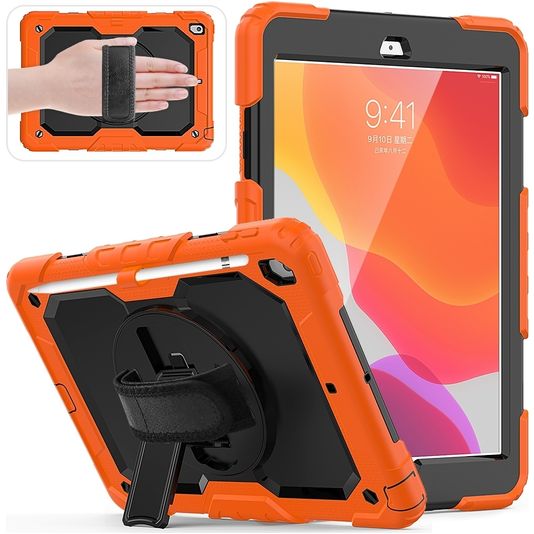 Mobigear SureGrip Xtreme Coque iPad 7 (2019) Coque arrière en Plastique rigide,Silicone + Porte-crayon + Bandoulière + Support Amovible - Noir / Orange