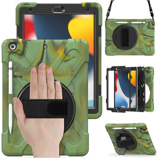 Mobigear SureGrip XGuard Coque iPad 7 (2019) Coque arrière en Plastique rigide,Silicone + Porte-crayon + Bandoulière + Support Amovible - Camouflage