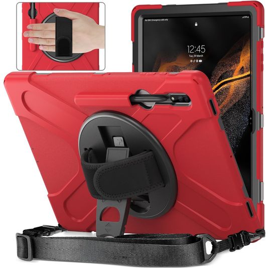 Mobigear SureGrip XGuard Coque Samsung Galaxy Tab S8 Ultra Coque arrière en Plastique rigide,Silicone + Porte-crayon + Bandoulière + Support Amovible - Rouge
