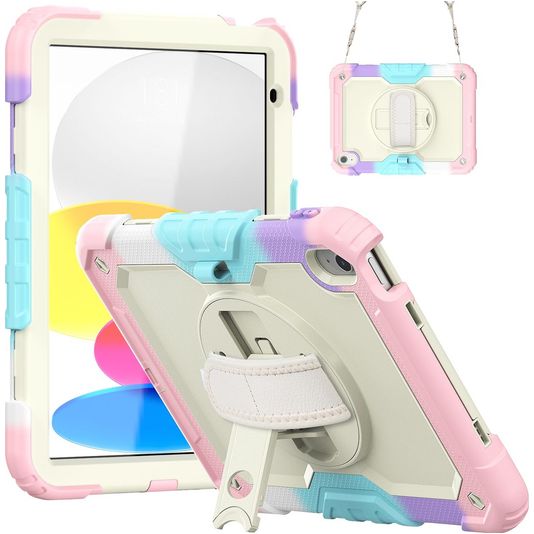 Mobigear SureGrip Xtreme Coque iPad 11 (2025) Coque arrière en Plastique rigide,Silicone + Bandoulière + Support Amovible - Rainbow