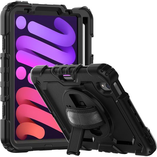 Mobigear SureGrip Xtreme Coque iPad Mini 7 (2024) Coque arrière en Plastique rigide,Silicone + Porte-crayon + Bandoulière + Support Amovible - Noir