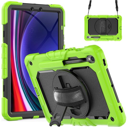 Mobigear SureGrip Xtreme Coque Samsung Galaxy Tab S9 FE Coque arrière en Plastique rigide,Silicone + Porte-crayon + Bandoulière + Support Amovible - Vert