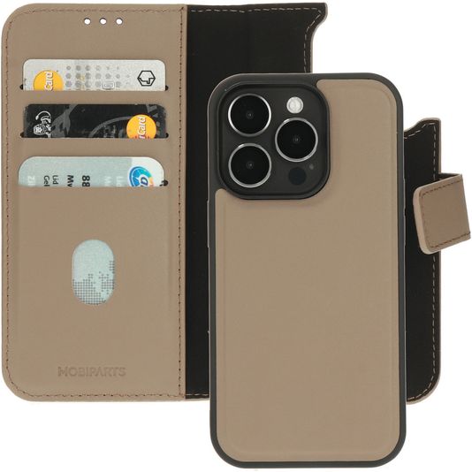 Mobiparts Housse iPhone 14 Pro MagSafe Etui avec Coque Détachable en Cuir Véritable Porte-Monnaie - Taupe