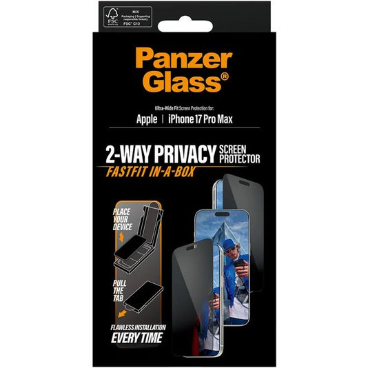 PanzerGlass FastFit iPhone 17 Pro Max Verre trempé Protection d'écran Confidentialité - Compatible Coque - Noir
